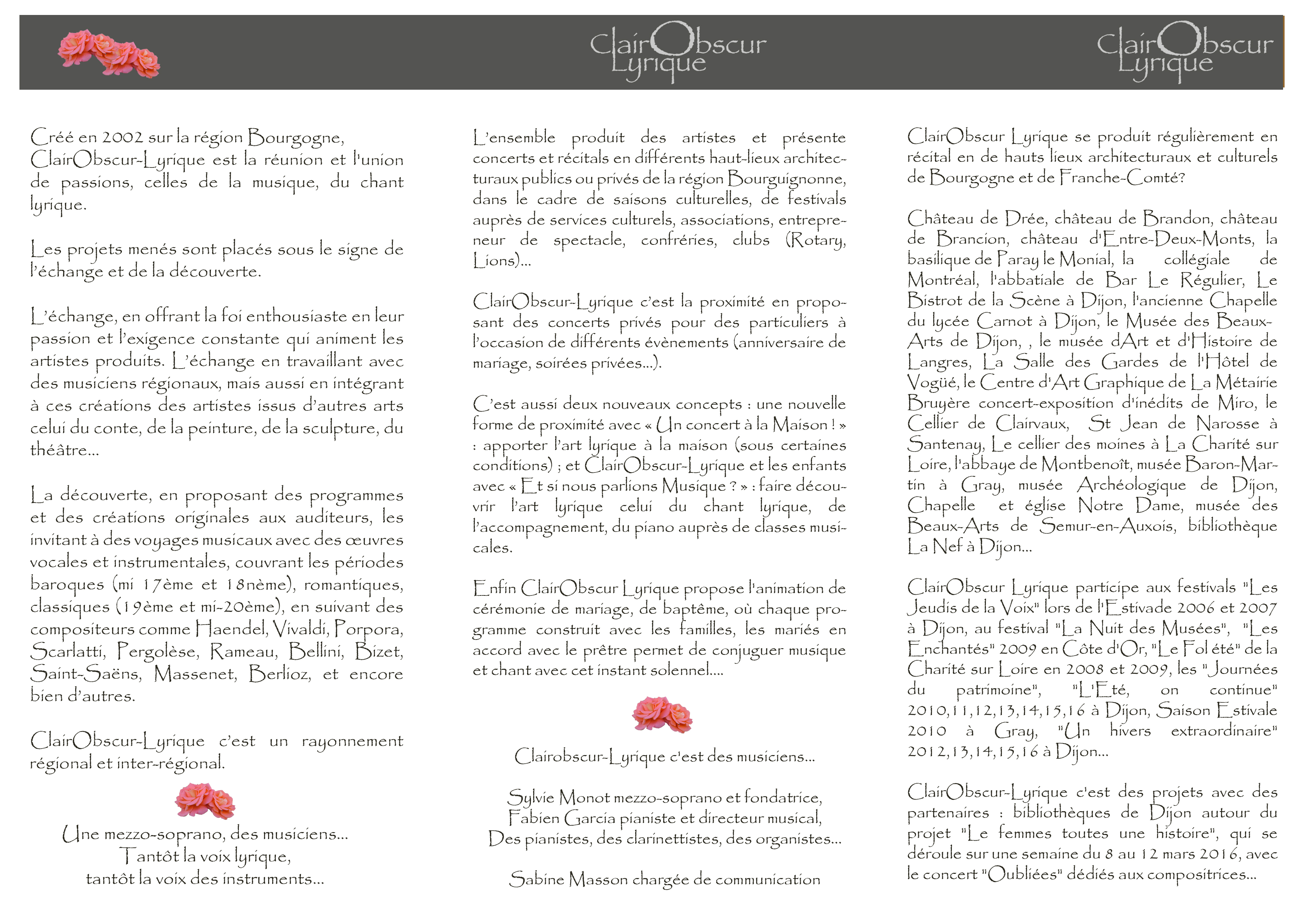 L’ensemble ClairObscur-Lyrique bénéficie du soutien de la Ville de Dijon, de la bibliothèque municipale de Dijon, de la direction des musées et du patrimoine de Dijon et de Prévalet Musique.